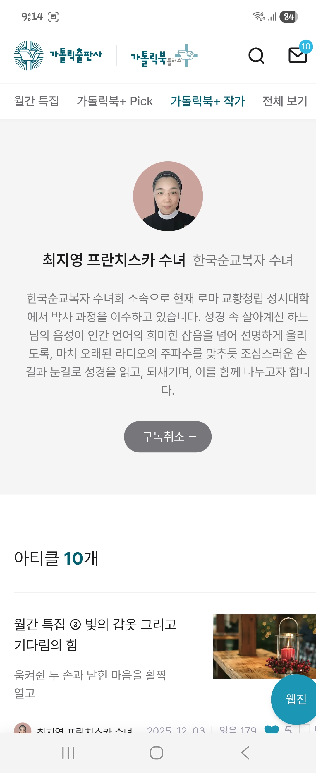 최지영 프란치스카 수녀님 구독하였어요^^