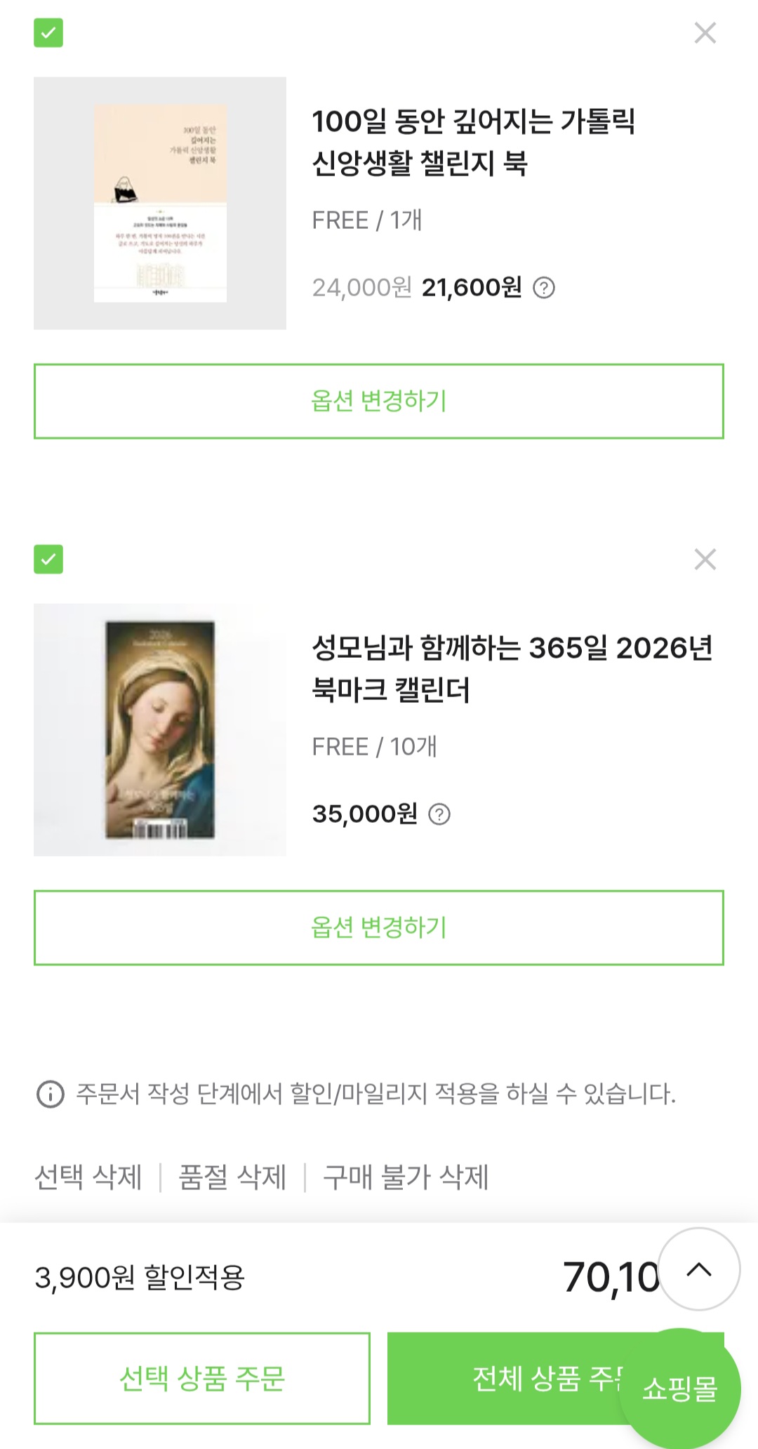 저를 위한 선물로 묵주(신앙생활을 다시 시작하는 기념)와 신앙생활 챌린지북,(생일도 곧 다가와요.🤭) 그리고 전부터 찜해놓은, 지인들과 나누고 싶은 성모님과 함께하는 2026년 북마크 캘린더를 장바구니에 담았습니다.^^