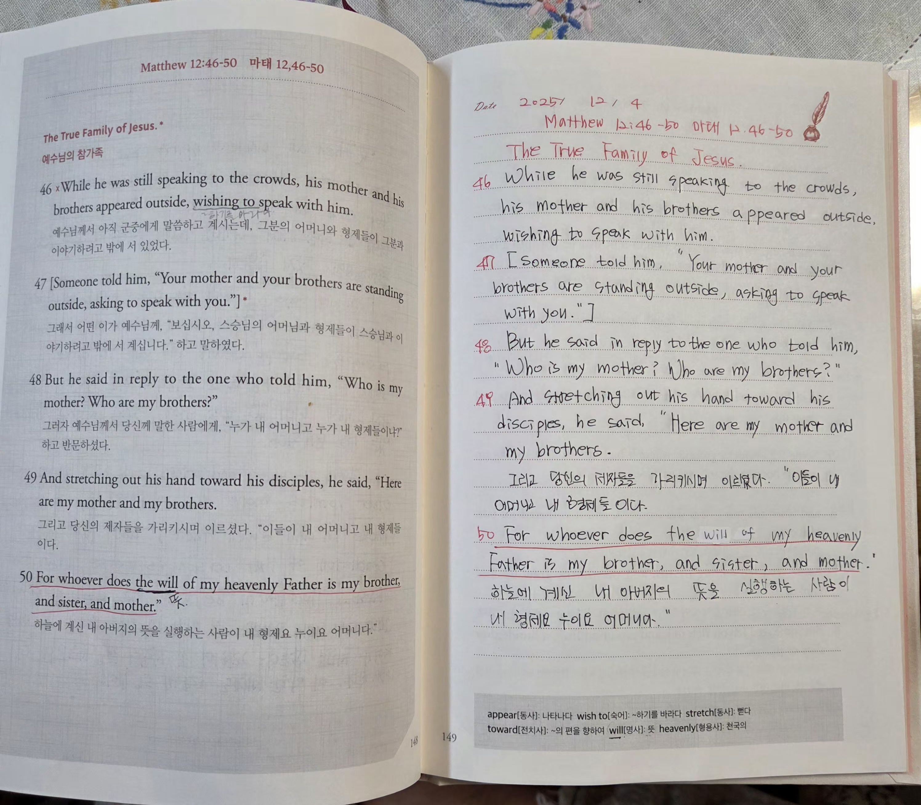 마태 12,50 "For whoever does the will of my heavenly Father is my brother,and sister,and mother."