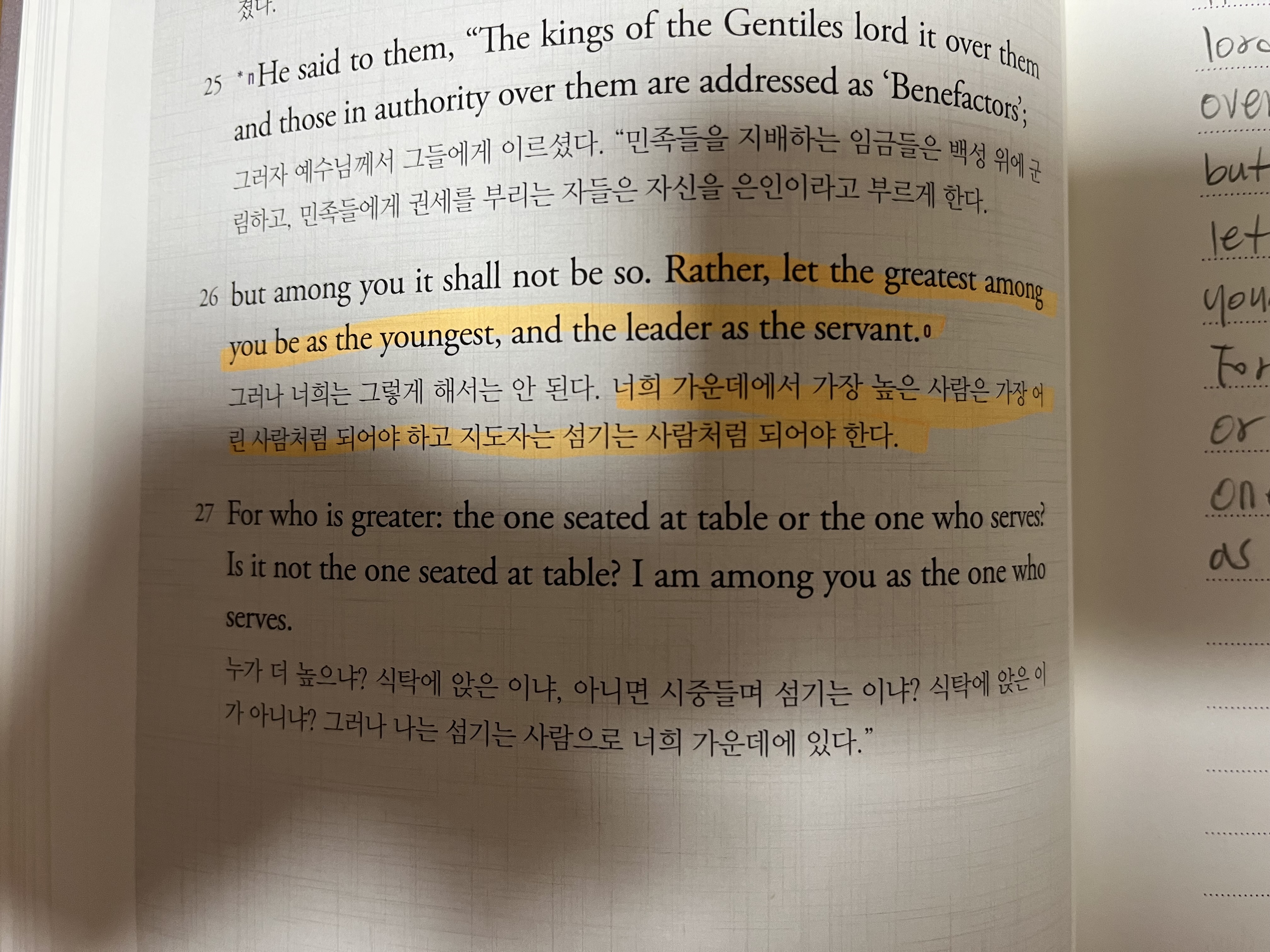 너희 가운데에서 가장 높은 사람은 가장 어린 사람처럼 되어야하고 지도자는 섬기는 사람처럼 되어야한다.