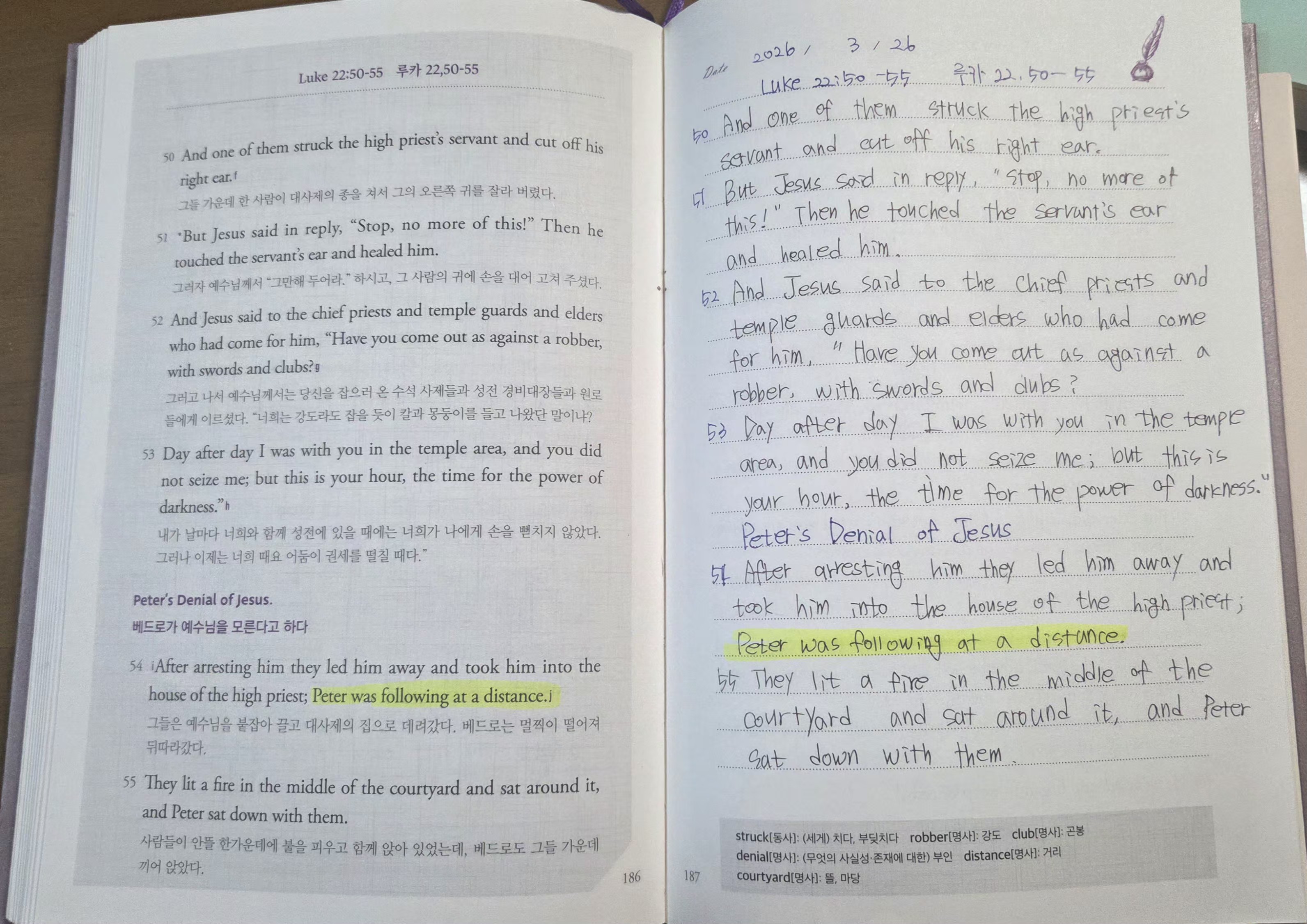 Luke 22:54 "Peter was following at a distance" 베드로는 멀찍이 떨어져 뒤따라 갔다.