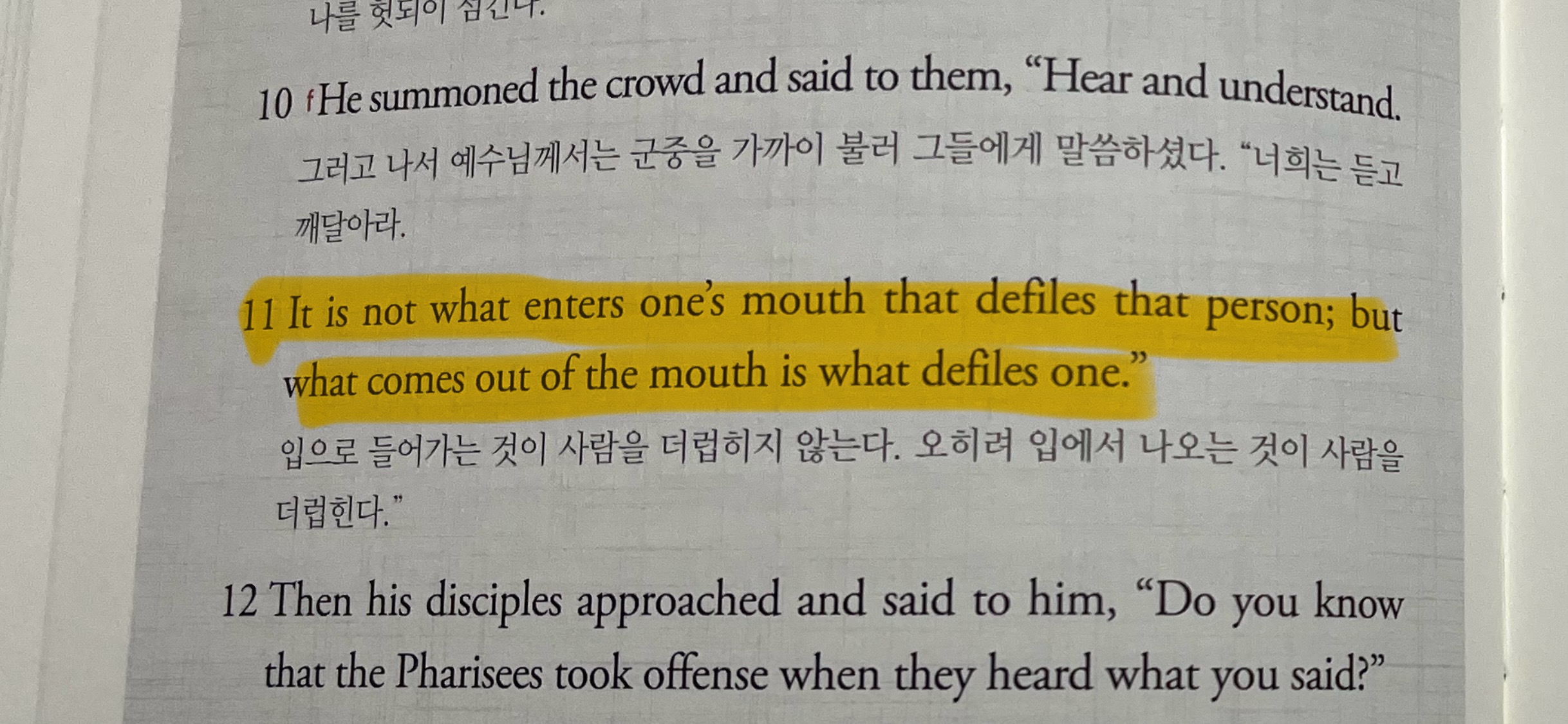 입으로 들어가는 것이 사람을 더럽히지 않는다. 오히려 입에서 나오는 것이 사람을 더럽힌다.