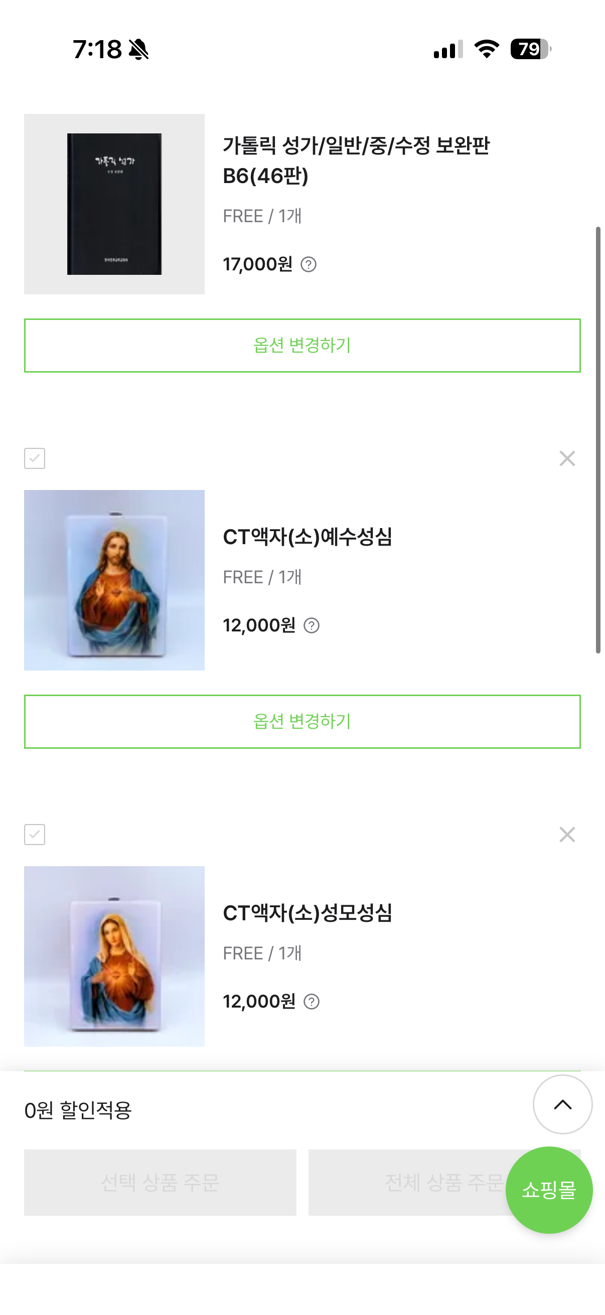 장바구니 보면 성가책 담아놓았는데 구매해서 한번 집에서 보고 싶어서 담았습니다. 또한 예수성심과 성모성심 액자도 집에 세워두고 기도할 때 보면서 하려고 담았습니다. 세례 받은지 1년도 되지 않았는데, 성모성심에 관심이 많아져서 다 하느님께서 이끌어주시는 것이 아닌가 싶습니다. 글 마치겠습니다. 평화를 빕니다!