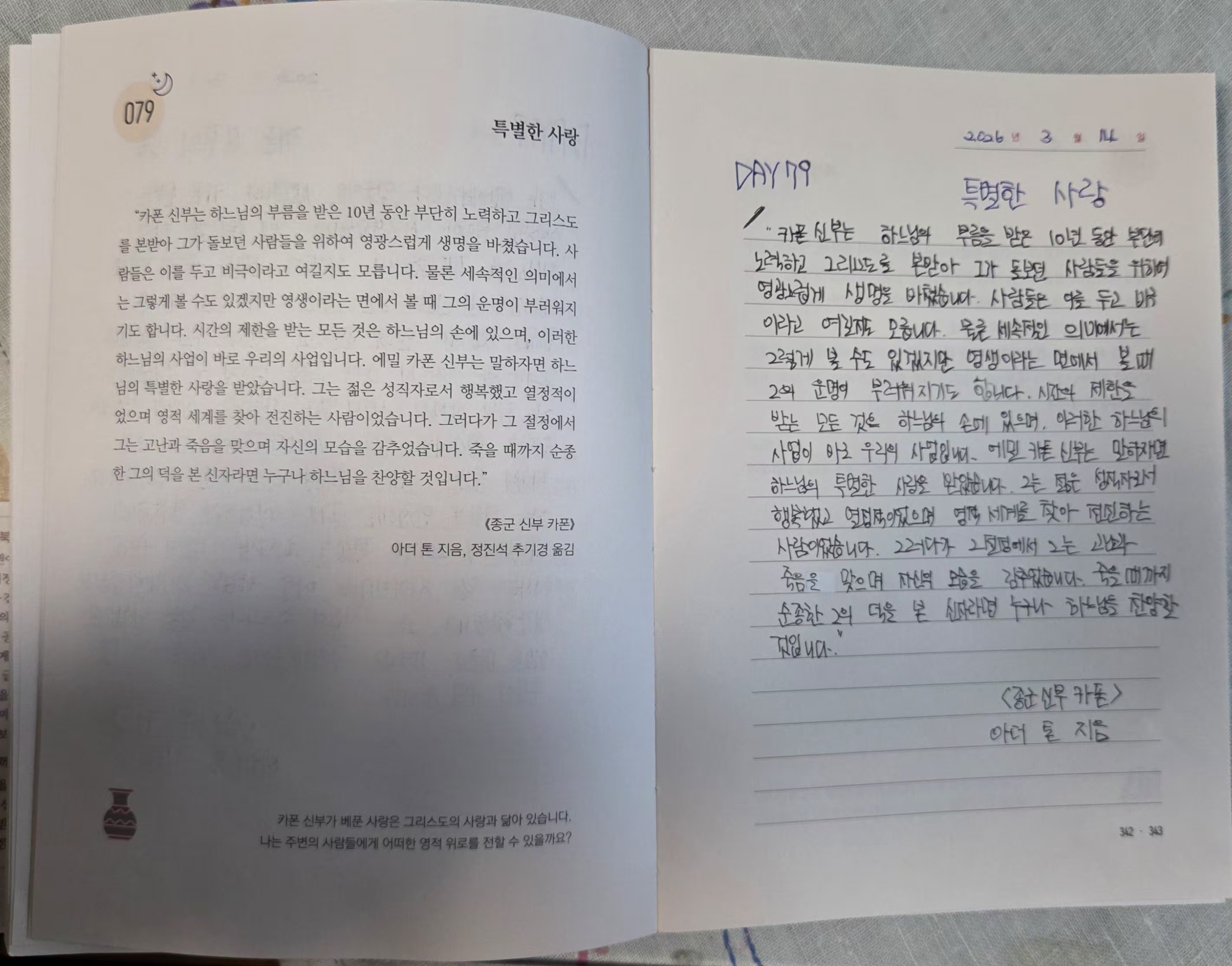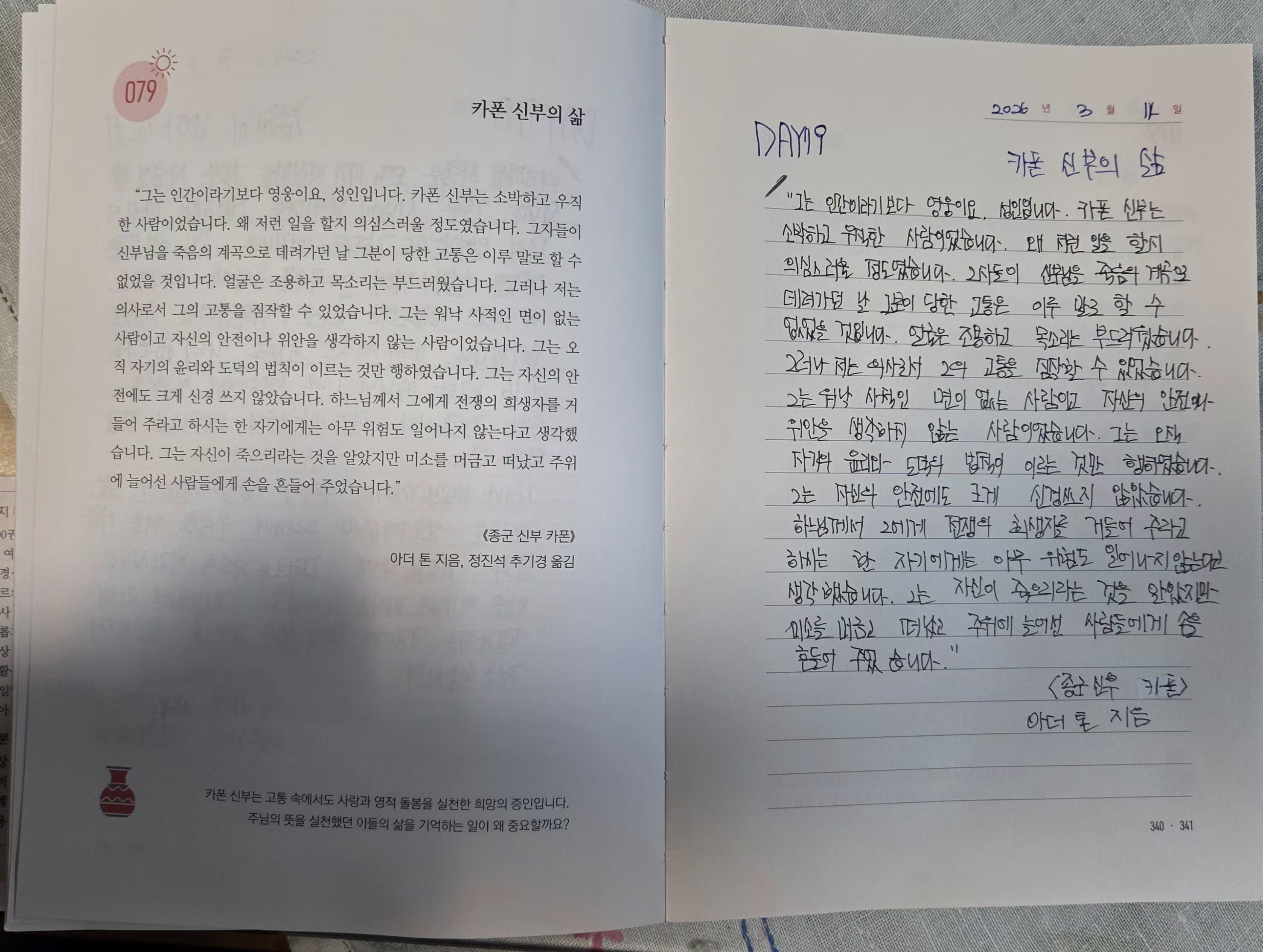 2926년3월14일DAY79<카폰신부의 삶,특별한사랑>필사인증합니다.