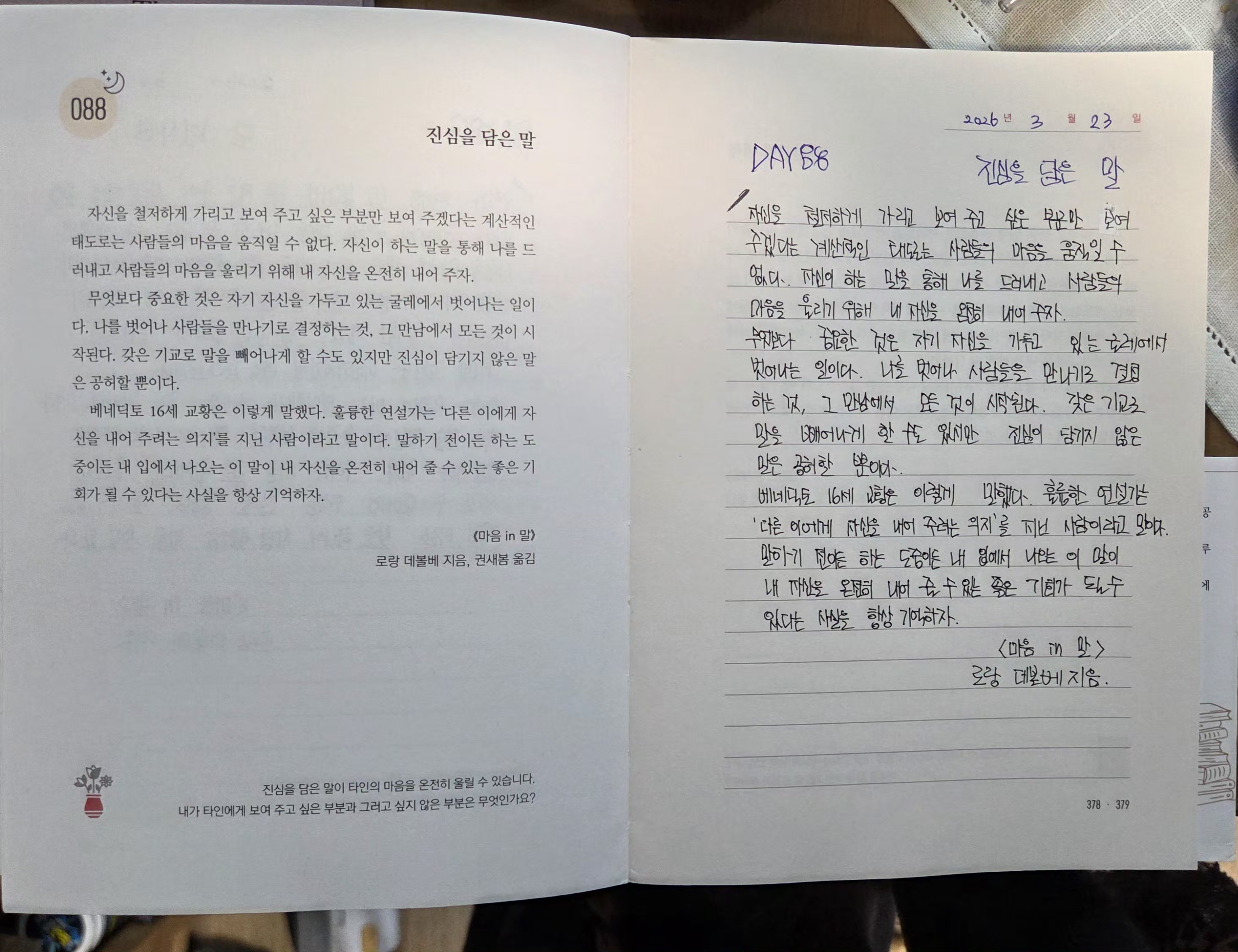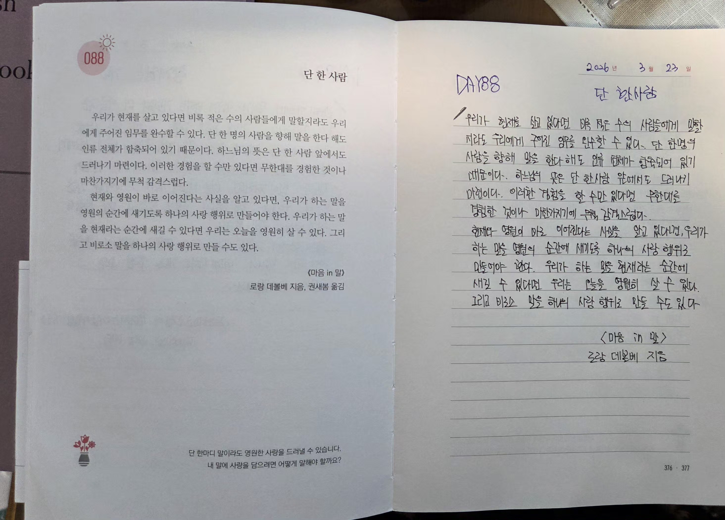 2026년 3월23일DAY88<단한사람,진심을 담은 말>필사인증합니다.