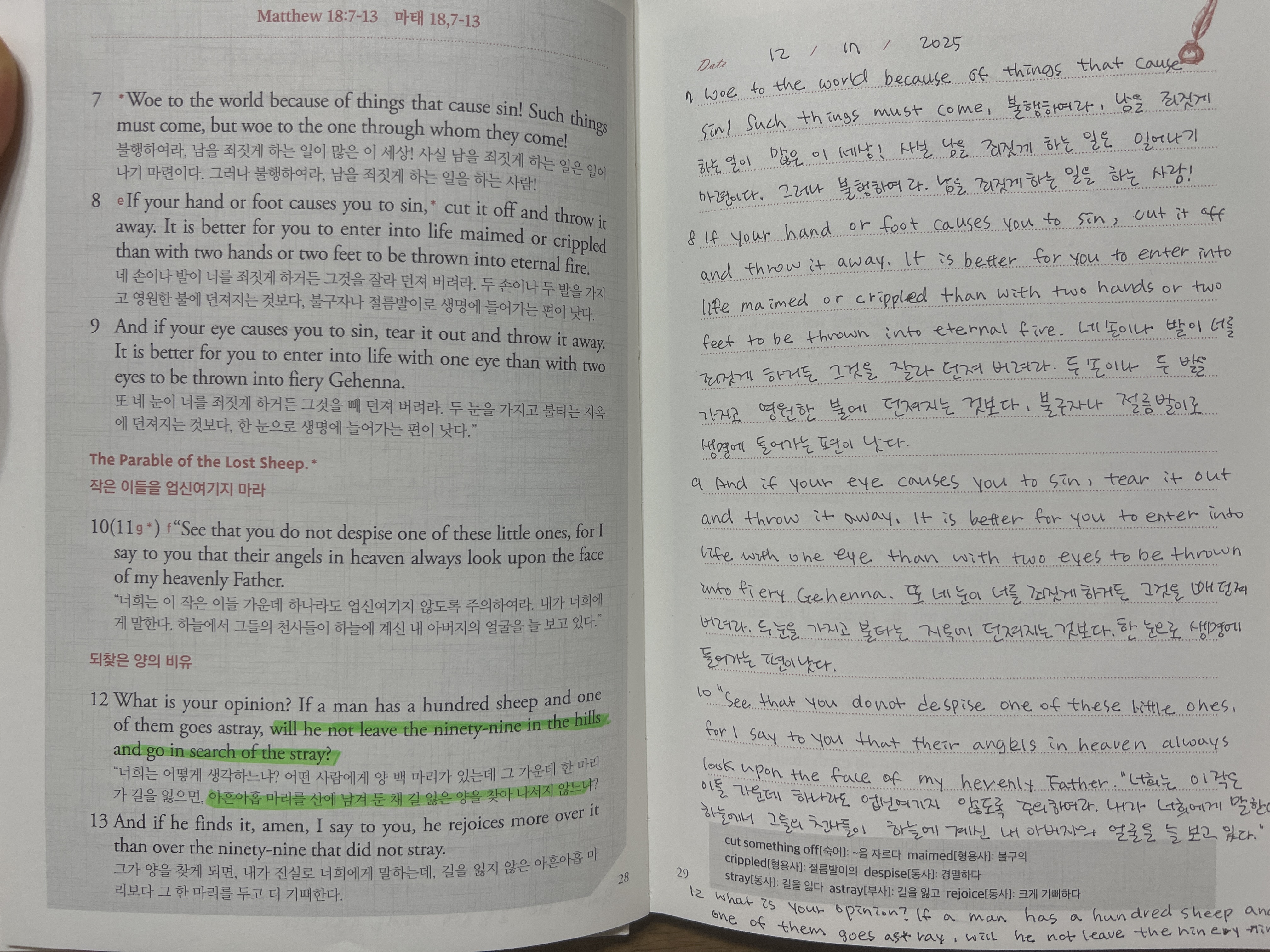 “너희는 어떻게 생각하느냐? 어떤 사람이 양 백 마리를 가지고 있었는데 그 가운데 하나가 길을 잃으면, 아흔아홉 마리를 산에 두고 가서 길 잃은 양을 찾아 나서지 않겠느냐?” 마태 18:12