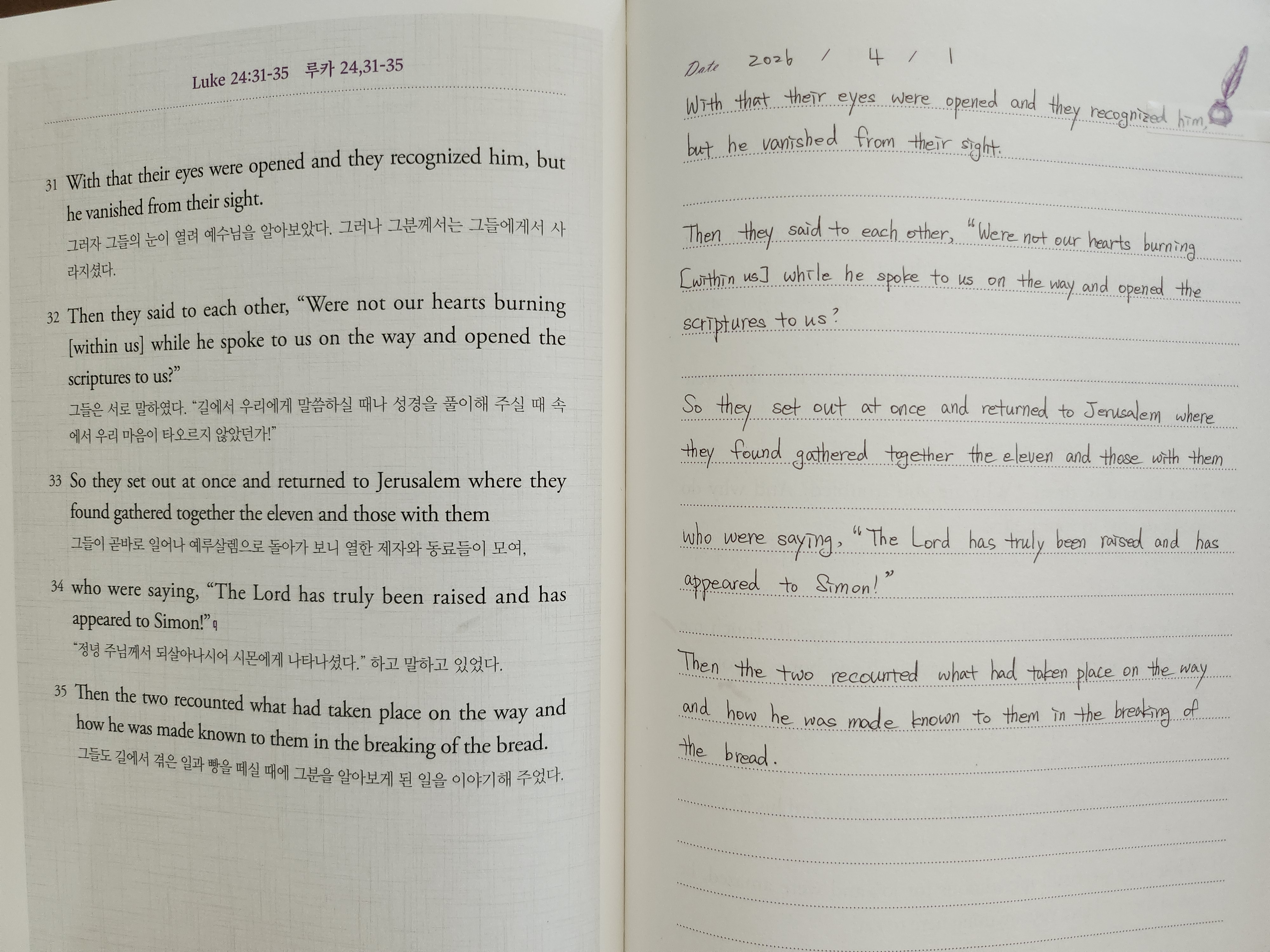 제가 성물방에서 처음 영어 성경 필사 노트를 봤을 땐 영어를 엄청 잘하시는 분들이 쓸 거라 생각했지, 제가 쓸 거라곤 상상도 못했는데 챌린지를 보며 나도 한 번 써볼까 하는 마음이 생기고, 조금 쓰다가 포기할 줄 알았는데 이렇게 끝까지 매일 필사를 할 수 있었던 것이 제 스스로도 놀랍고, 이 또한 주님의 은총, 성령의 이끄심이 있었기에 가능했던 것 같습니다. 가끔 몸이 아프거나 피곤함에 유혹도 있었지만 같이 필사하는 분들이 계셔서 힘이 났고, 챌린자 담당자님의 깜짝 선물과 응원도 큰 힘이 되었습니다. 기쁨과 설렘으로 시작했던 성경 필사 챌리지 참 뜻깊고 좋은 시간이었습니다. 모두 감사드립니다.♡