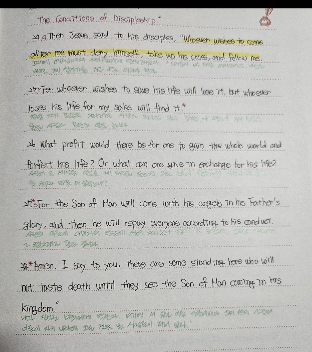 누구든지 내 뒤를 따라오려면 , 자신을 버리고 제 십자가를 지고 나를 따라야 한다.