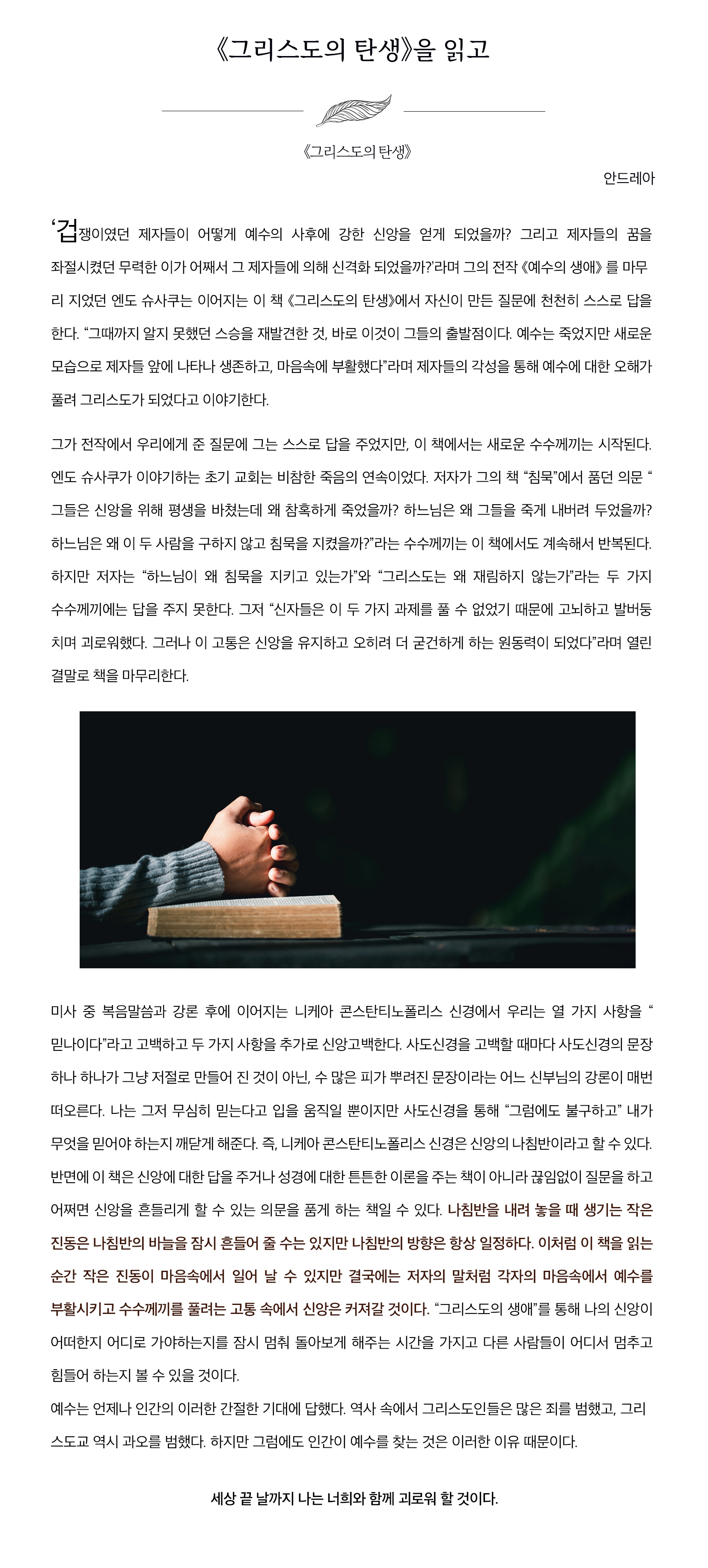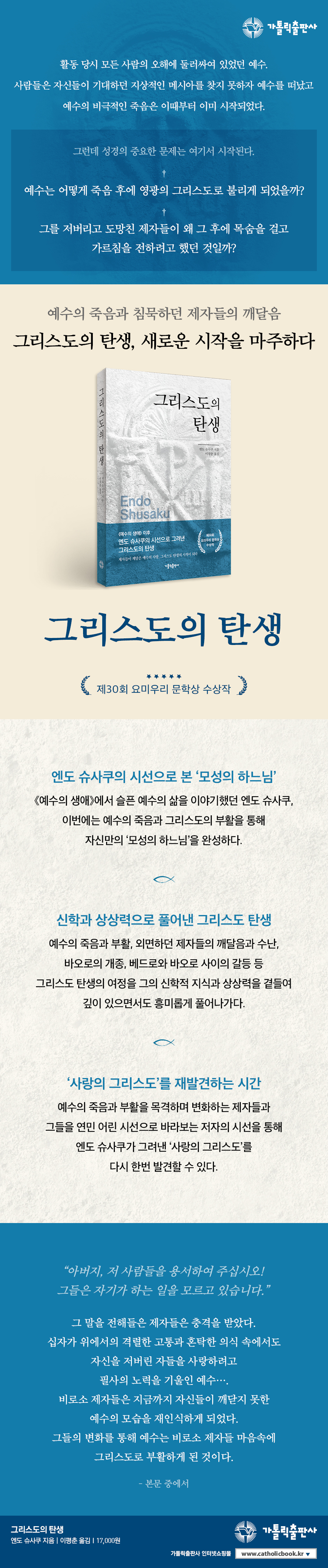 엔도 슈사쿠는 스승을 버리고 도망쳤던 제자들이 예수를 그리스도로 믿기까지의 과정을 쓰지 않으면 《예수의 생애》도 완결되지 않는다고 말했다. 많은 이들이 믿음의 대상에 대해서만 질문을 던지지만, 엔도 슈사쿠는 신앙과 믿음을 받아들이는 우리의 모습 또한 기록해야 함을 깨닫고 있었던 것이다. 그래서 이 책을 통해 나의 신앙과 믿음에 대해 다시 한번 생각해 볼 수 있다. 예수를 그리스도로 받아들인 제자들처럼 말이다.