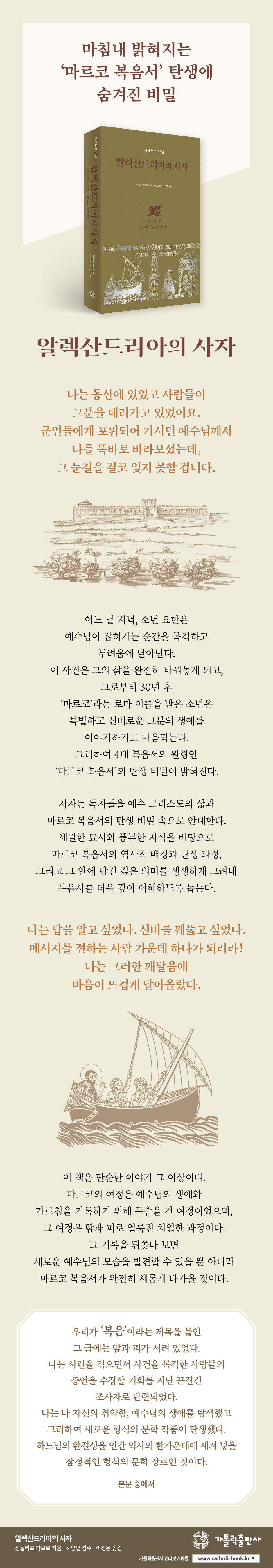 예루살렘의 소년 요한. 바로 그가 네 복음서(마태오, 마르코, 루카, 요한) 중 가장 처음으로 쓰인 마르코 복음서의 저자 마르코다. 《알렉산드리아의 사자》는 마르코의 생애와 그가 복음서를 쓰게 된 경위를 소설로 풀어 낸 책이다. 프랑스의 성서학자이자 교수로서 유튜브 등 소셜네트워크에서 활발하게 활동하고 있는 장필리프 파브르 신부가 쓴 이 소설은 성경과 전승을 바탕으로 상상력을 가미하여 마르코 복음사가에 대한 이야기를 흥미롭게 전개해 나간다.