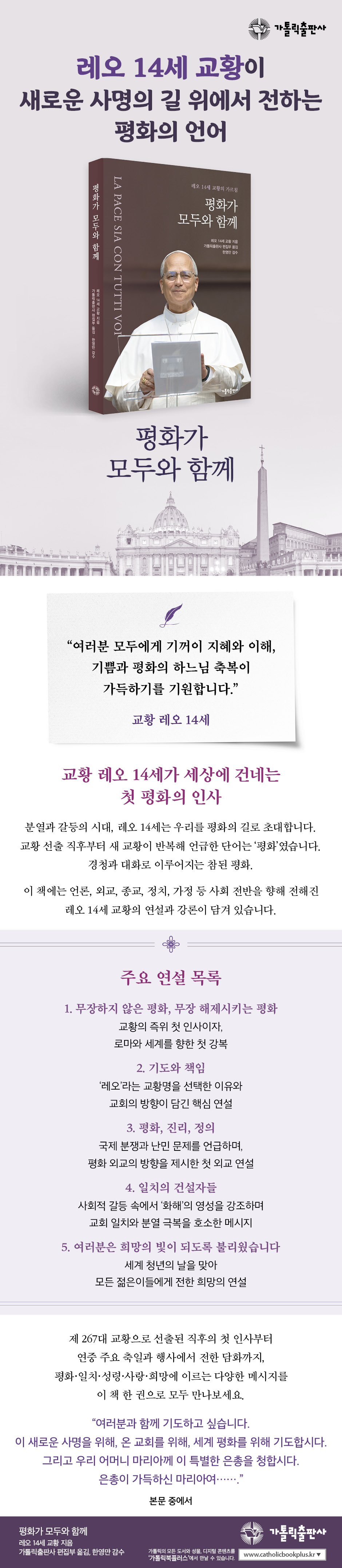 교황의 메시지는 신앙의 테두리를 넘어 오늘을 살아가는 모든 이들에게 인간으로서의 우선순위를 다시 세우도록 요청한다. 분열과 갈등의 시대에 전하는 레오 14세 교황의 첫 가르침은 우리 공동체가 앞으로 새로운 지혜를 마련하고 연대를 회복하는 출발점이 되어 줄 것이다. 교황의 가르침을 따라가며 우리가 지금 어디에 서 있는지, 무엇을 잃어버렸는지, 그리고 어떤 방향으로 걸어가야 할지 되돌아볼 수 있기를 바란다.