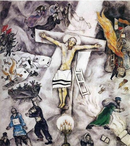 그림의 첫인상은 샤갈 그림의 독특한 특성으로 몽환적으로 느껴지지만, 작품의 내용을 들여다보면, 처참한 고통이 담겨 있다. 샤갈은 유대인으로서 느끼는 시대의 고통을 이 그림 속에 담아냈다.